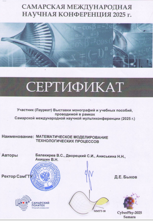 Поздравляем авторов научного издания » Математическое моделирование технологических процессов»  Балакирев В.С., Дворецкий С.И., Аниськина Н.Н., Акишин В.Н. с участием в выставке монографий и учебных пособий, проводимой в рамках Самарской международной научной мультиконференции (2025г.)